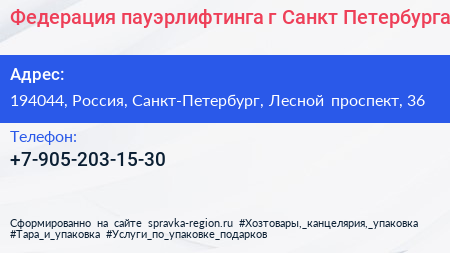 Федерация пауэрлифтинга г. Санкт-Петербурга по адресу 194044, Россия, Санкт-Петербург, Лесной проспект, 36 в дальнейшем Организация, размещена в следующих категориях: