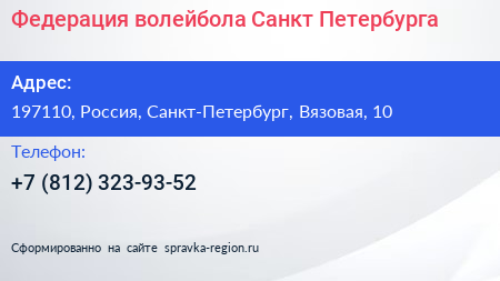 Федерация волейбола Санкт-Петербурга по адресу 197110, Россия, Санкт-Петербург, Вязовая, 10 в дальнейшем Организация, размещена в следующих категориях: