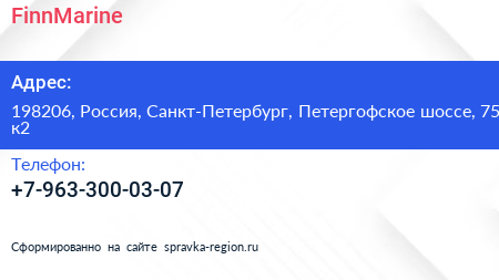 FinnMarine по адресу 198206, Россия, Санкт-Петербург, Петергофское шоссе, 75 к2 в дальнейшем Организация, размещена в следующих категориях: