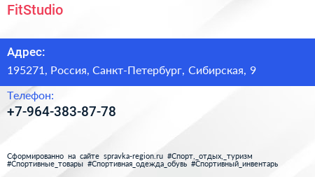 FitStudio по адресу 195271, Россия, Санкт-Петербург, Сибирская, 9 в дальнейшем Организация, размещена в следующих категориях: