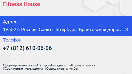 Fitness House по адресу 195027, Россия, Санкт-Петербург, Брантовская дорога, 3 в дальнейшем Организация, размещена в следующих категориях: