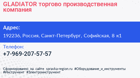 GLADIATOR, торгово-производственная компания по адресу 192236, Россия, Санкт-Петербург, Софийская, 8 к1 в дальнейшем Организация, размещена в следующих категориях: