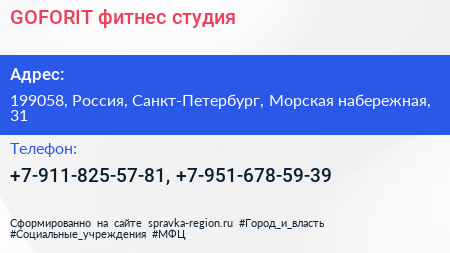 GOFORIT, фитнес-студия по адресу 199058, Россия, Санкт-Петербург, Морская набережная, 31 в дальнейшем Организация, размещена в следующих категориях: