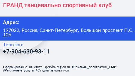 ГРАНД, танцевально-спортивный клуб по адресу 197022, Россия, Санкт-Петербург, Большой проспект П.С., 106 в дальнейшем Организация, размещена в следующих категориях: