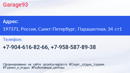 Garage93 по адресу 197371, Россия, Санкт-Петербург, Парашютная, 34 ст1 в дальнейшем Организация, размещена в следующих категориях: