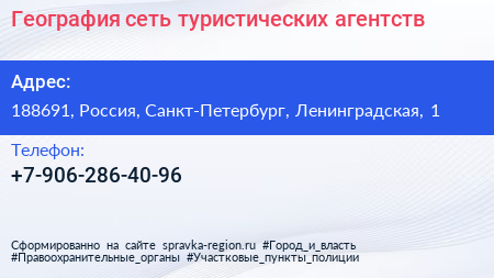 География, сеть туристических агентств по адресу 188691, Россия, Санкт-Петербург, Ленинградская, 1 в дальнейшем Организация, размещена в следующих категориях: