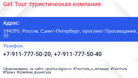 Get Tour, туристическая компания по адресу 194295, Россия, Санкт-Петербург, проспект Просвещения, 35 в дальнейшем Организация, размещена в следующих категориях:
