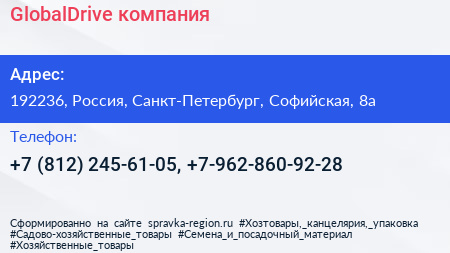GlobalDrive, компания по адресу 192236, Россия, Санкт-Петербург, Софийская, 8а в дальнейшем Организация, размещена в следующих категориях: