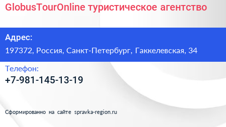 GlobusTourOnline, туристическое агентство по адресу 197372, Россия, Санкт-Петербург, Гаккелевская, 34 в дальнейшем Организация, размещена в следующих категориях:
