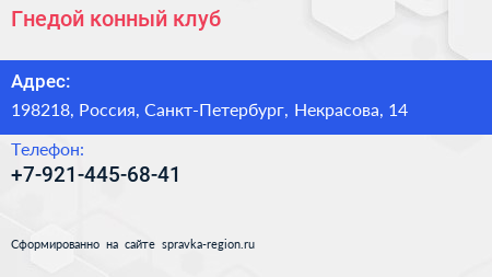 Гнедой, конный клуб по адресу 198218, Россия, Санкт-Петербург, Некрасова, 14 в дальнейшем Организация, размещена в следующих категориях: