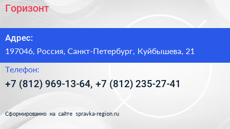 Горизонт по адресу 197046, Россия, Санкт-Петербург, Куйбышева, 21 в дальнейшем Организация, размещена в следующих категориях: