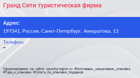 Гранд Сити, туристическая фирма по адресу 197341, Россия, Санкт-Петербург, Аккуратова, 13 в дальнейшем Организация, размещена в следующих категориях: