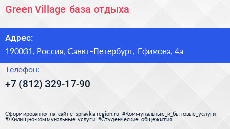 Green Village, база отдыха по адресу 190031, Россия, Санкт-Петербург, Ефимова, 4а в дальнейшем Организация, размещена в следующих категориях: