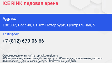 ICE RINK, ледовая арена по адресу 188507, Россия, Санкт-Петербург, Центральная, 5 в дальнейшем Организация, размещена в следующих категориях: