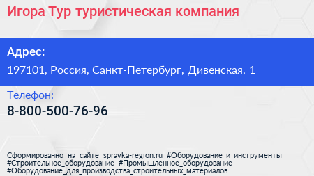 Игора Тур, туристическая компания по адресу 197101, Россия, Санкт-Петербург, Дивенская, 1 в дальнейшем Организация, размещена в следующих категориях:
