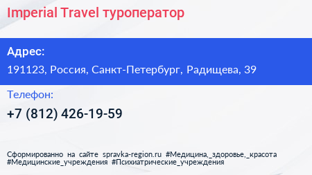Imperial Travel, туроператор по адресу 191123, Россия, Санкт-Петербург, Радищева, 39 в дальнейшем Организация, размещена в следующих категориях: