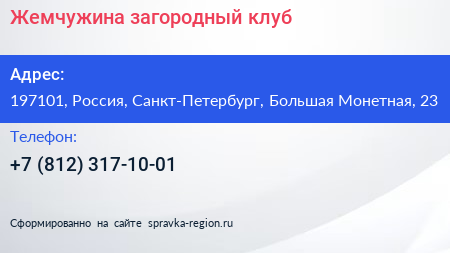 Жемчужина, загородный клуб по адресу 197101, Россия, Санкт-Петербург, Большая Монетная, 23 в дальнейшем Организация, размещена в следующих категориях: