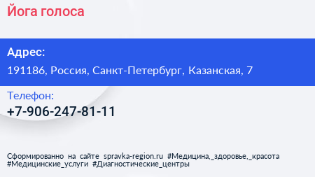 Йога голоса по адресу 191186, Россия, Санкт-Петербург, Казанская, 7 в дальнейшем Организация, размещена в следующих категориях: