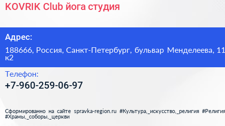 KOVRIK Club, йога-студия по адресу 188666, Россия, Санкт-Петербург, бульвар Менделеева, 11 к2 в дальнейшем Организация, размещена в следующих категориях:
