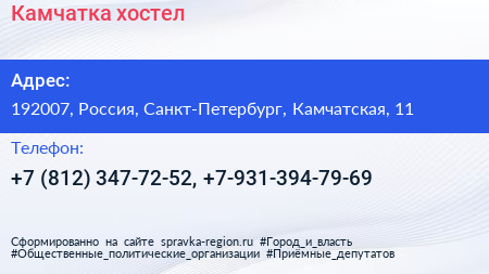 Камчатка, хостел по адресу 192007, Россия, Санкт-Петербург, Камчатская, 11 в дальнейшем Организация, размещена в следующих категориях: