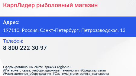 КарпЛидер, рыболовный магазин по адресу 197110, Россия, Санкт-Петербург, Петрозаводская, 13 в дальнейшем Организация, размещена в следующих категориях: