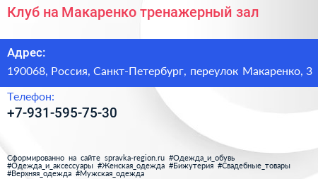 Клуб на Макаренко, тренажерный зал по адресу 190068, Россия, Санкт-Петербург, переулок Макаренко, 3 в дальнейшем Организация, размещена в следующих категориях: