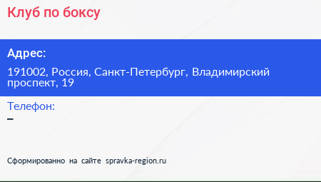 Клуб по боксу по адресу 191002, Россия, Санкт-Петербург, Владимирский проспект, 19 в дальнейшем Организация, размещена в следующих категориях: