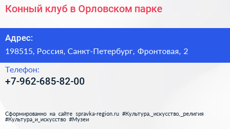 Конный клуб в Орловском парке по адресу 198515, Россия, Санкт-Петербург, Фронтовая, 2 в дальнейшем Организация, размещена в следующих категориях: