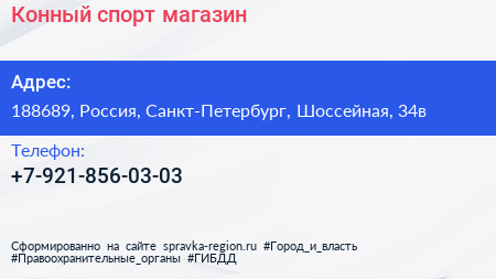 Конный спорт, магазин по адресу 188689, Россия, Санкт-Петербург, Шоссейная, 34в в дальнейшем Организация, размещена в следующих категориях: