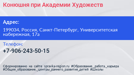 Конюшня при Академии Художеств по адресу 199034, Россия, Санкт-Петербург, Университетская набережная, 17а в дальнейшем Организация, размещена в следующих категориях: