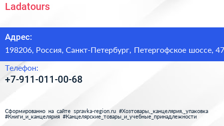 Ladatours по адресу 198206, Россия, Санкт-Петербург, Петергофское шоссе, 47 в дальнейшем Организация, размещена в следующих категориях: