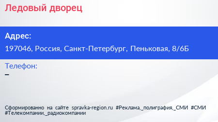 Ледовый дворец по адресу 197046, Россия, Санкт-Петербург, Пеньковая, 8/6Б в дальнейшем Организация, размещена в следующих категориях: