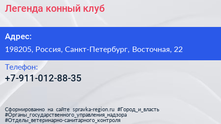 Легенда, конный клуб по адресу 198205, Россия, Санкт-Петербург, Восточная, 22 в дальнейшем Организация, размещена в следующих категориях: