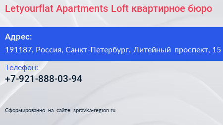 Letyourflat Apartments Loft, квартирное бюро по адресу 191187, Россия, Санкт-Петербург, Литейный проспект, 15 в дальнейшем Организация, размещена в следующих категориях: