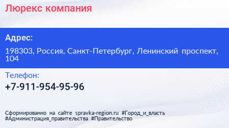 Люрекс, компания по адресу 198303, Россия, Санкт-Петербург, Ленинский проспект, 104 в дальнейшем Организация, размещена в следующих категориях: