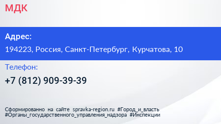 МДК по адресу 194223, Россия, Санкт-Петербург, Курчатова, 10 в дальнейшем Организация, размещена в следующих категориях: