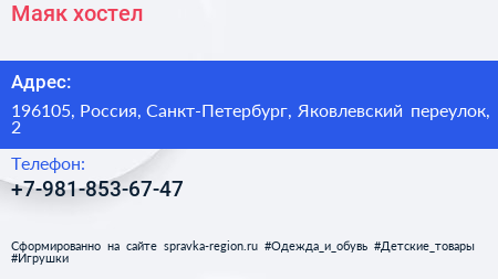 Маяк, хостел по адресу 196105, Россия, Санкт-Петербург, Яковлевский переулок, 2 в дальнейшем Организация, размещена в следующих категориях: