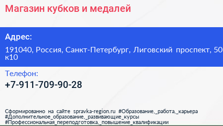 Магазин кубков и медалей по адресу 191040, Россия, Санкт-Петербург, Лиговский проспект, 50 к10 в дальнейшем Организация, размещена в следующих категориях: