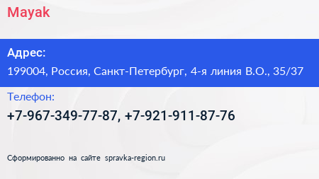 Mayak по адресу 199004, Россия, Санкт-Петербург, 4-я линия В.О., 35/37 в дальнейшем Организация, размещена в следующих категориях: