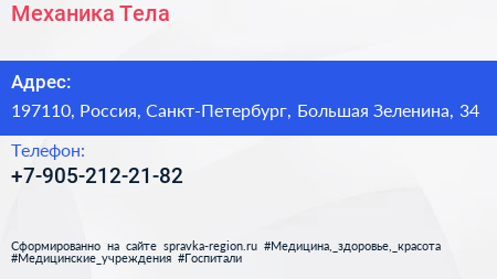 Механика Тела по адресу 197110, Россия, Санкт-Петербург, Большая Зеленина, 34 в дальнейшем Организация, размещена в следующих категориях: