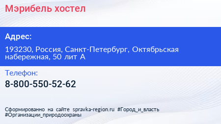 Мэрибель, хостел по адресу 193230, Россия, Санкт-Петербург, Октябрьская набережная, 50 лит А в дальнейшем Организация, размещена в следующих категориях: