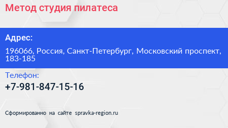 Метод, студия пилатеса по адресу 196066, Россия, Санкт-Петербург, Московский проспект, 183-185 в дальнейшем Организация, размещена в следующих категориях: