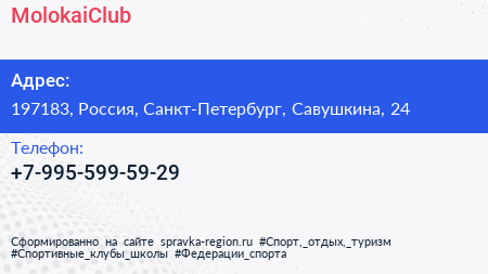 MolokaiClub по адресу 197183, Россия, Санкт-Петербург, Савушкина, 24 в дальнейшем Организация, размещена в следующих категориях: