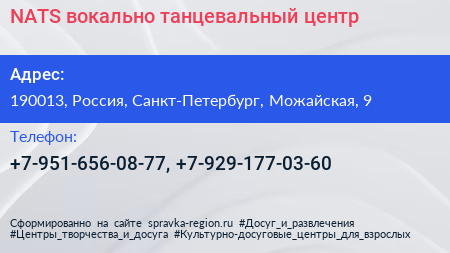 NATS, вокально-танцевальный центр по адресу 190013, Россия, Санкт-Петербург, Можайская, 9 в дальнейшем Организация, размещена в следующих категориях: