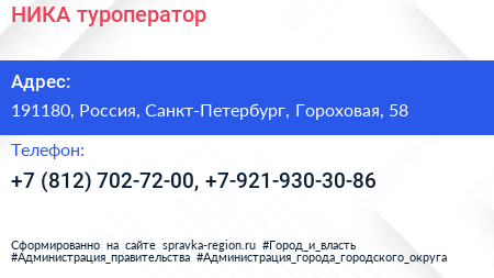 НИКА, туроператор по адресу 191180, Россия, Санкт-Петербург, Гороховая, 58 в дальнейшем Организация, размещена в следующих категориях: