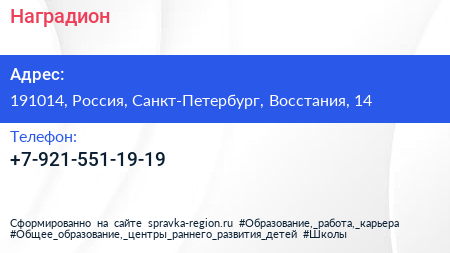 Наградион по адресу 191014, Россия, Санкт-Петербург, Восстания, 14 в дальнейшем Организация, размещена в следующих категориях: