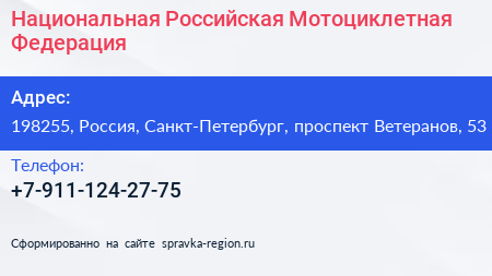 Национальная Российская Мотоциклетная Федерация по адресу 198255, Россия, Санкт-Петербург, проспект Ветеранов, 53 в дальнейшем Организация, размещена в следующих категориях: