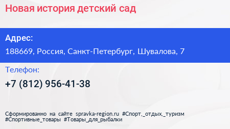 Новая история, детский сад по адресу 188669, Россия, Санкт-Петербург, Шувалова, 7 в дальнейшем Организация, размещена в следующих категориях: