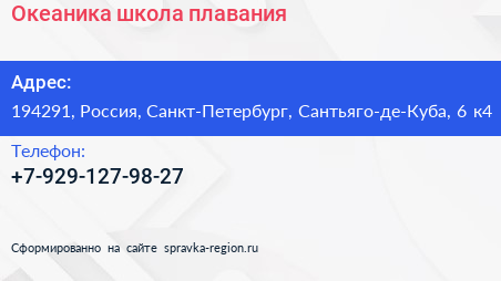 Океаника, школа плавания по адресу 194291, Россия, Санкт-Петербург, Сантьяго-де-Куба, 6 к4 в дальнейшем Организация, размещена в следующих категориях: