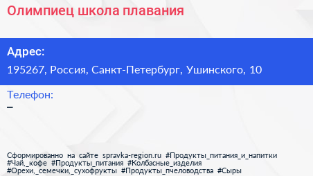 Олимпиец, школа плавания по адресу 195267, Россия, Санкт-Петербург, Ушинского, 10 в дальнейшем Организация, размещена в следующих категориях: